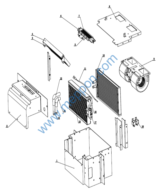 蒸发器总成 Evaporator 下壳体焊合件 Shell 进风装置焊合件 Air inlet device 内循环纸滤芯 Internal circulation filter 内循环滤芯外框 Plate 风门电机 Motor 外循环滤芯外框 Plate 外循环纸滤芯 Enternal circulation filter 上盖板焊合件 Shell 蒸发风机 Evaporator motor 制热器 Cooler core 感温探头 Air outlet 进水软管 Hose 水管接头 Connector 出水软管 Hose器3015.0-40-10 制冷器芯 Cooler core 继电器 Relay 膨胀阀 Valve 过渡管组件 Hose Assembly |