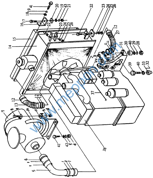 Clamp Hose Φ64×120 Washer 10 Nut M10 Hose Hose Φ64×90 Air filter Bolt M8×60 Clamp Rubber strip 510×20×4 Filter bracket Clamp 35-51 Rubber tube Water box Radiator Radiator bracket Bolt M10×45 Washer 10 Washer 10 Gasket Nut M10 Bolt M12×40 Gasket Washer 12 Washer 12 Nut M12 Rubber tube Nut M16 |